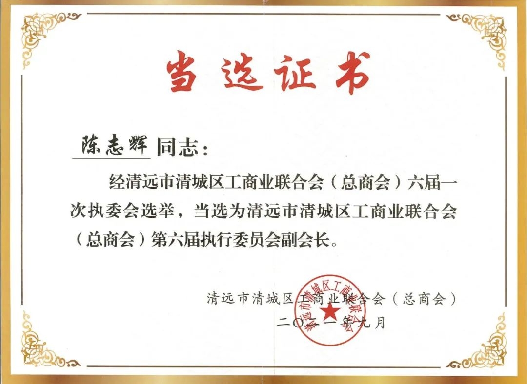 熱烈祝賀我司總經(jīng)理陳志輝當(dāng)選第六屆清城區(qū)工商聯(lián)副會(huì)長(zhǎng)